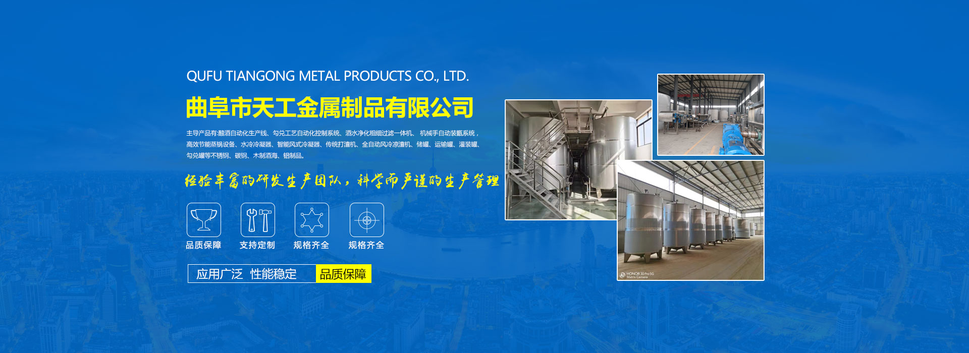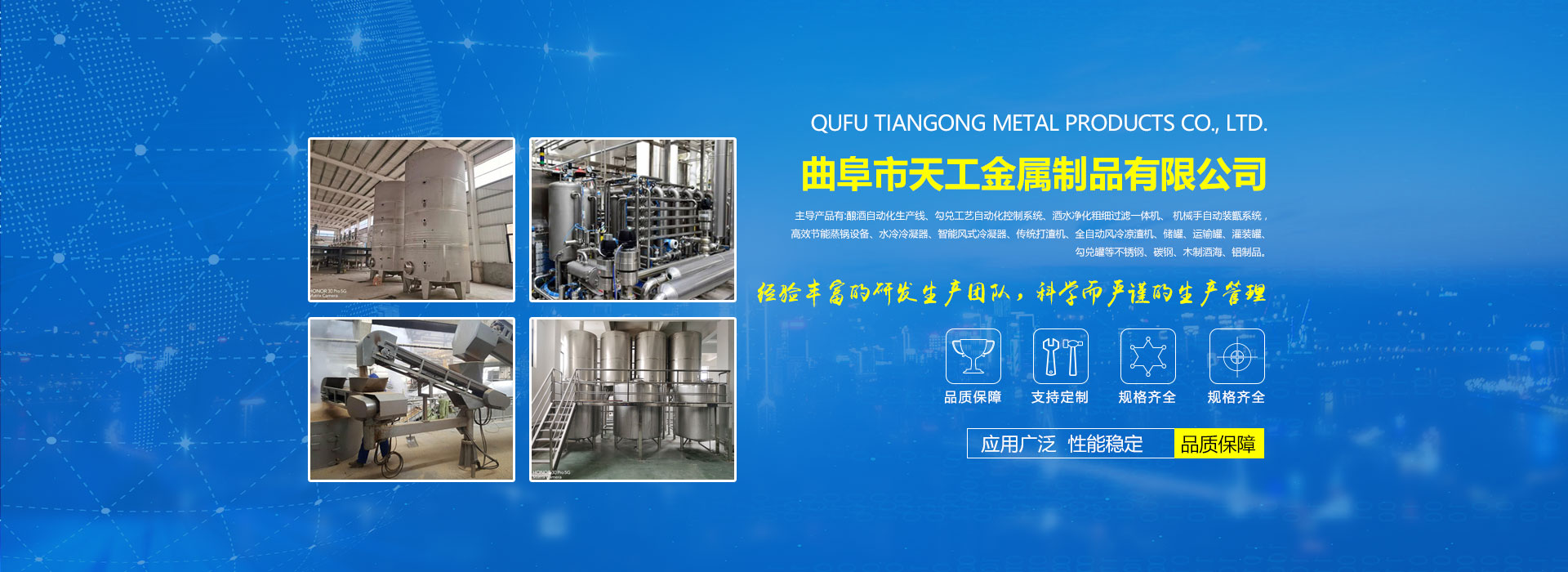 公司擁有功能齊全的化驗(yàn)室、試驗(yàn)室,一支高水平的設(shè)計(jì)研發(fā)團(tuán)隊(duì)。機(jī)械設(shè)備、激光切割機(jī)、激光焊接機(jī)、數(shù)控機(jī)床、數(shù)字加工中心,氬弧焊、電氣焊、等離子切割機(jī)一應(yīng)俱全。技術(shù)力量雄厚,有釀造設(shè)備專家3名,工程師5名,大專學(xué)歷15名,中專學(xué)歷50名,員工全部持有由勞動(dòng)技術(shù)部門,考核頒發(fā)的中級(jí)以上技術(shù)證書。公司配有嚴(yán)格的質(zhì)量管理保證體系。通過了ISO9000質(zhì)量體系認(rèn)證,ISO9001質(zhì)量管理體系認(rèn)證,獲得多項(xiàng)國家發(fā)明專利和實(shí)用新型專利。